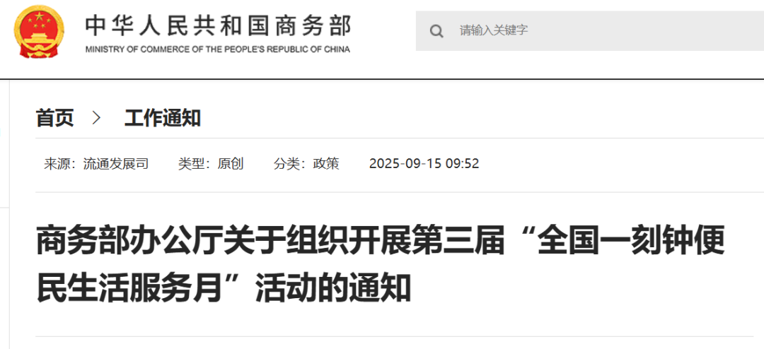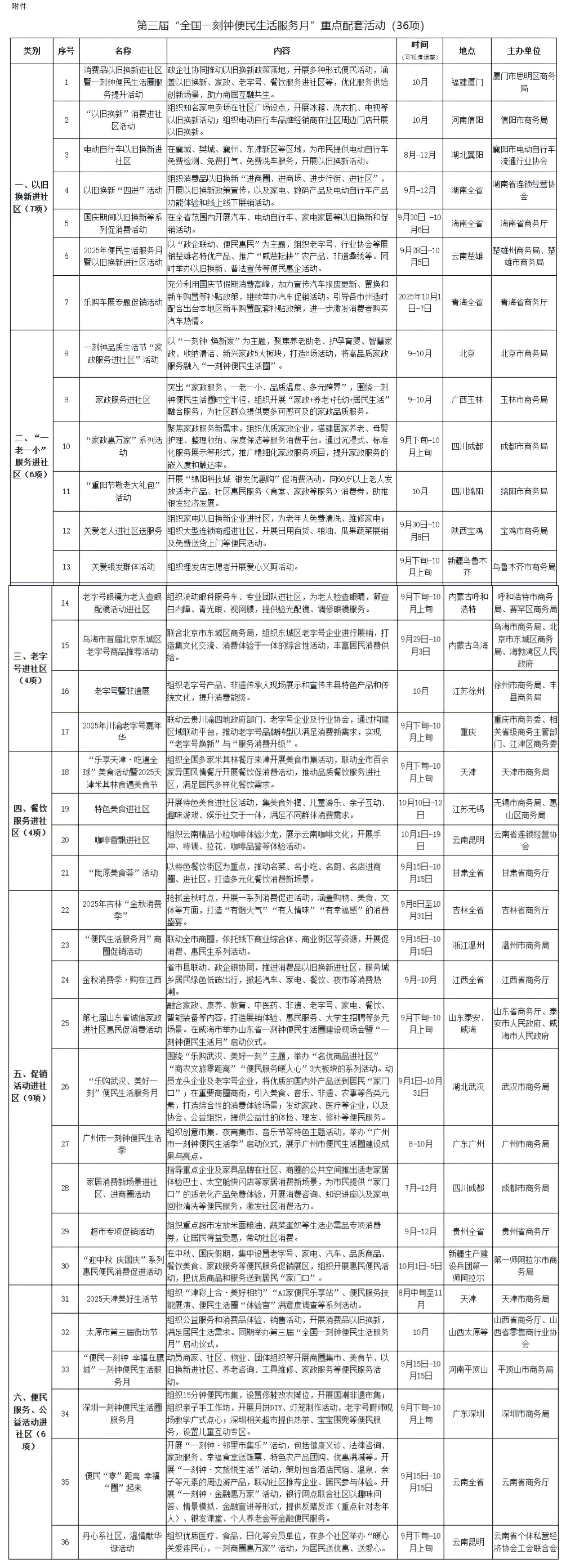 各省、自治区、直辖市及计划单列市、新疆生产建设兵团商务主管部门:为落实商务部等13部门印发的《全面推进城市一刻钟便民生活圈建设三年行动计划(2023-2025)》,健全加快生活性服务业多样化发展机制,畅通经济微循环,实现惠民生和促消费,商务部将组织开展第三届“全国一刻钟便民生活服务月”活动。现将有关事项通知如下:按照“政府搭台、企业唱戏、多方联动、居民受益”方式,动员城市一刻钟便民生活圈全国和省级试点地区、全域推进先行区试点地区积极行动起来,结合“购在中国”系列活动总体安排和消费品以旧换新、服务消费季、老字号等重点工作部署,以中秋、国庆、重阳等节假日和时令节气为契机,突出服务“一老一小”,自主确定活动内容和举办时间,因地制宜开展形式多样的便民服务活动,广泛调动各类主体参与,通过丰富供给、创新场景、提升体验,进一步便利居民生活,营造商居和谐的良好氛围。(一)推动消费品以旧换新进社区。鼓励家电以旧换新、手机等数码产品购新补贴政策参与主体,在社区搭建展示区、实景体验区等场景,举办宣传促销活动,引导生产、销售、平台、售后服务和回收企业在社区设立便民服务点。鼓励汽车生产、流通、回收企业在社区宣传汽车以旧换新政策,在有条件的社区开展汽车展示展销、体验试驾等活动。鼓励家居卖场、家居产品和家装企业、电商平台在社区设置样板间,拓展家居产品清洁、维修、保养等配套服务。充分发挥位于街道社区的电动自行车销售网点作用,依法依规引导合规电动自行车生产、销售、回收企业开展以旧换新政策宣传、产品展示等活动。(二)推动“一老一小”服务进社区。鼓励老年用品销售、康复辅助器具购置和租赁服务进社区,开展老年用品和服务展示体验活动。鼓励养老机构、家政企业、物业服务企业开展居家养老上门服务活动,提供助洁助浴等服务。推动零售服务商、金融机构网点、社会工作服务机构等拓展助老服务功能。鼓励银发旅游列车、邮轮旅行、旅居康养宣传活动进社区。鼓励开展形式多样的文体娱乐、敬老孝老活动。组织母婴店、儿童书店、亲子餐厅、青少年运动馆、撸猫撸狗馆等开展优惠促销活动。鼓励托育服务机构开展政策宣讲和服务展示。鼓励社区图书馆、文化馆、美术馆等向儿童免费开放。(三)推动老字号进社区。鼓励老字号企业聚焦传统节日和重要假期,加大节令、时令商品供应,推出更多贴近社区居民日常生活需要的新产品新服务。结合“老字号嘉年华”活动,支持有条件的社区开展老字号体验日、文化周等特色活动。(四)推动餐饮服务进社区。结合2025年“中华美食荟”活动,鼓励名菜、名小吃、名厨、名店进社区,开展餐饮优惠促销、美食品鉴、技艺展示等各具特色的体验活动和老年助餐服务,鼓励地方传承发扬传统烹饪技艺和餐饮文化。(五)推动促销活动进社区。联动平台企业、优质商超、商业街区开展惠民促销活动,推动国货潮品、外贸优品、本地精品、国际名品进社区,依法依规设置展区展台,丰富社区消费场景。因地制宜开展服务设施、新业态新模式的宣传展示,提升服务的普惠性和可及度。组织商文旅体健融合活动,结合传统节日习俗开展各类民俗表演、技艺展示、游艺活动。(六)推动便民服务、公益宣传进社区。鼓励街道社区、相关协会和企业深入社区,举办跳蚤市场、社区市集,开展便民义卖、爱心理发、公益集市、小修小补、就业帮扶等便民服务活动。鼓励宣传推广一刻钟便民生活圈网点地图、“小修小补”便民地图,引导更多点位“进图”,让居民“找得到”。鼓励开展一次性塑料制品减量使用、循环利用,垃圾分类与节能减排等宣传活动。倡导绿色生活方式和绿色消费理念,以群众喜闻乐见的方式,凝聚社会共识。各地商务主管部门要认真筹划部署,因地制宜组织开展便民生活服务月活动,整合政策资源、市场资源,抓好分工落实,可结合工作实际适当延长活动时间。要积极动员有关行业协会、企业,以及电商平台、支付平台、中国银联等金融服务机构广泛参与,引导推出各具特色的优惠活动。要充分利用电视、报刊、网络及各类新媒体,全渠道全方位开展宣传报道。全国和省级试点地区、全域推进先行区试点地区要主动作为,组织开展形式多样的便民服务活动,抓好重点配套活动(见附件)落实。活动期间,要加强市场秩序、食品安全、环境卫生管理等,确保安全有序。附件:第三届“全国一刻钟便民生活服务月”重点配套活动