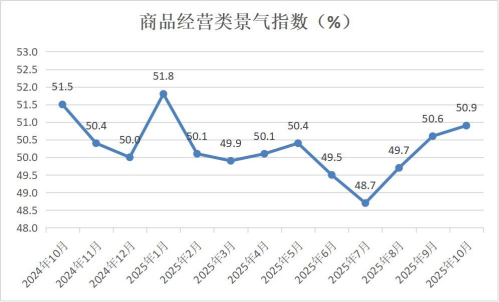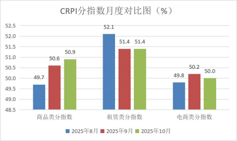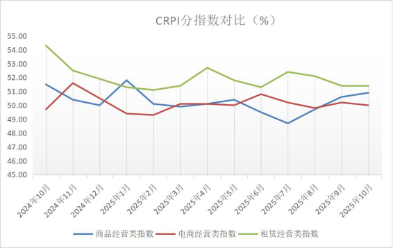2025年10月10日,中国商业联合会发布10月份中国零售业景气指数(CRPI)。10月份,中国零售业景气指数(CRPI)为50.7%,较上月微升0.1个百分点,连续3个月上升,创近9个月新高。三大类分指数均处于扩张区间:商品经营类指数为50.9%,环比小幅上升0.3个百分点;租赁经营类指数为51.4%,环比持平,维持在中高位景气区间;电商经营类指数为50.0%,环比微降 0.2 个百分点,维持在扩张区间。分析认为,今年的国庆中秋在同一时段,假期长,气候适宜,出行旅游是多数人消费选择,零售市场在9月底畅旺之后,十一期间虽没有高峰,但个性化消费和节日消费的气氛持续不断,不仅带动十月的零售市场,而且显现出消费增长的活力和趋势。但整体看增幅不大,也可以看到消费是理性和谨慎的。从行业分类看,10月零售业三大分类指数均处于扩张区间。商品经营类指数为50.9%,较上月小幅上升0.3 个百分点,线下消费持续扩张;租赁经营类指数为51.4%,较上月持平,保持在中高位景气区间;电商经营类指数为50.0%,较上月微降0.2个百分点,保持在扩张区间。商品经营类指数为50.9%,较上月小幅上升0.3个百分点。构成商品经营类CRPI 的3个正向分指数销售额、盈利水平和客单价水平都处于临界点以上,1个反向分指数主营运营成本处于临界点以下,呈现良好的经营态势。分析认为,十月份国庆中秋双节叠加,探亲旅行活动增多,闲暇时间更多,礼品消费、个性化消费、家庭换季消费促使线下商品经营零售活跃。销售额指数为52.9%,较上月小幅上升0.3个百分点,创近9个月新高,表明10月份线下商品零售预期持续好转。盈利水平指数为51.8%,较上月下降0.6个百分点,保持在扩张区间,表明商品经营类企业对10月份的盈利增长预期稳定。客单价水平指数为51.8%,较上月小幅回落0.3个百分点,表明销售额增加来源于客流量增长。主营业务运营成本反向指数为48.1%,较上月回升1.0个百分点,表明商品经营类企业预期运营成本回归常态。租赁经营类指数为51.4%,较上月持平,保持在中高位扩张区间运行。构成租赁经营类CRPI的3个正向分指数平均单店租金收入、商铺出租率和运营场所增减处于临界点上方,1个反向分指数综合运营成本变化处于临界点下方。平均单店租金收入指数为51.7%,较上月下降1.6个百分点,保持在中高位景气区间运行。分析认为,平均单店租金收入指数连续两个月下降表明租赁经营类企业租金收入预期有所下降。商铺出租率指数为53.6%,较上月回升2.2个百分点。分析认为,租金水平下行和假日消费预期有助于商铺出租率指数回升。经营场所增减指数为51.9%,较上月回升0.8个百分点,表明租赁经营企业开店预期稳定。综合运营成本反向指数为49.2%,较上月下降0.5个百分点,表明租赁经营类企业运营成本保持稳定。电商经营类指数为50.0%,较上月微降0.2个百分点,保持在扩张区间。构成电商经营类 CRPI的2个正向分指数电商实物总销售额和电商在线总商品数均处于临界点以上;1个正向分指数电商客单价水平和1个反向分指数电商经营总成本均处于临界点以下。电商实物总销售额指数为50.1%,较上月微降0.1个百分点,表明本月线上商品零售额增长预期稳定。电商在线总商品数指数为50.8%,较上月上升0.8个百分点,表明本月电商经营类企业备货意愿回升,双十一销售在提前。电商客单价水平指数为49.7%,较上月小幅下降0.4个百分点。电商总成本反向指数为49.8%,较上月小幅下降0.4个百分点,表明电商作双十一促销,经营成本略有上升。(一)CRPI三个分指数对比显示,10月份零售业景气指数均处于扩张区间。 (二)10月份租赁经营类企业的平均单店租金收入景气指数下行,商铺出租率景气指数上行。中国零售业景气指数(CRPI)是反映当期零售业经营预期变化情况的综合指数。CRPI高于50%时,反映零售业总体较上月扩张;低于50%,则反映零售业总体较上月收缩。CRPI是通过对中国零售业运营经理的月度调查结果统计汇总、编制而成的指数,它包括消费领域商品类、租赁类和电商类3类零售企业/平台,涵盖了客流量、销售额、租金收入、客单价等多个重要指标,是零售业先行性景气指数的最新探索。涉及国家标准《零售业态分类》(GB/T18106-2021)中的 3 个行业大类,50 个品牌集团企业,3000多家调查样本,涵盖20000多个零售门店经营状况变化情况:其中,商品类、租赁类和电商类零售企业样本权重分别约占64%、16%、20%。以经营超市、便利店、百货店、折扣店、仓储会员店、品牌专卖店、专业店等有店铺零售为主的零售企业界定为商品类;以经营各类型购物中心为主商业管理企业界定为租赁类;依托电子商务平台经营商品服务为主的零售企业界定为电商类。零售业运营经理月度调查借鉴 PPS(Probability Proportional to Size)抽样方法,以商品类、租赁类、电商类零售业大类为层,大类样本按其销售额占零售业消费品总额的比重分配,层内样本使用具有整体和地域代表性的企业样本。本调查由中国商业联合会具体组织实施,利用在线问卷对零售业运营经理进行月度问卷调查。(1)分类指数的计算方法。零售业景气指标体系包括12个细分指数,表征零售业各细分领域发展的景气状况、发展潜力与政策支撑环境。零售业景气指标体系中,商品类包括消费额、客单价、盈利水平、主营运营成本4个分类指数;租赁类包括平均单店租金收入、商铺出租率、经营场所增减、综合运营成本 4 个分类