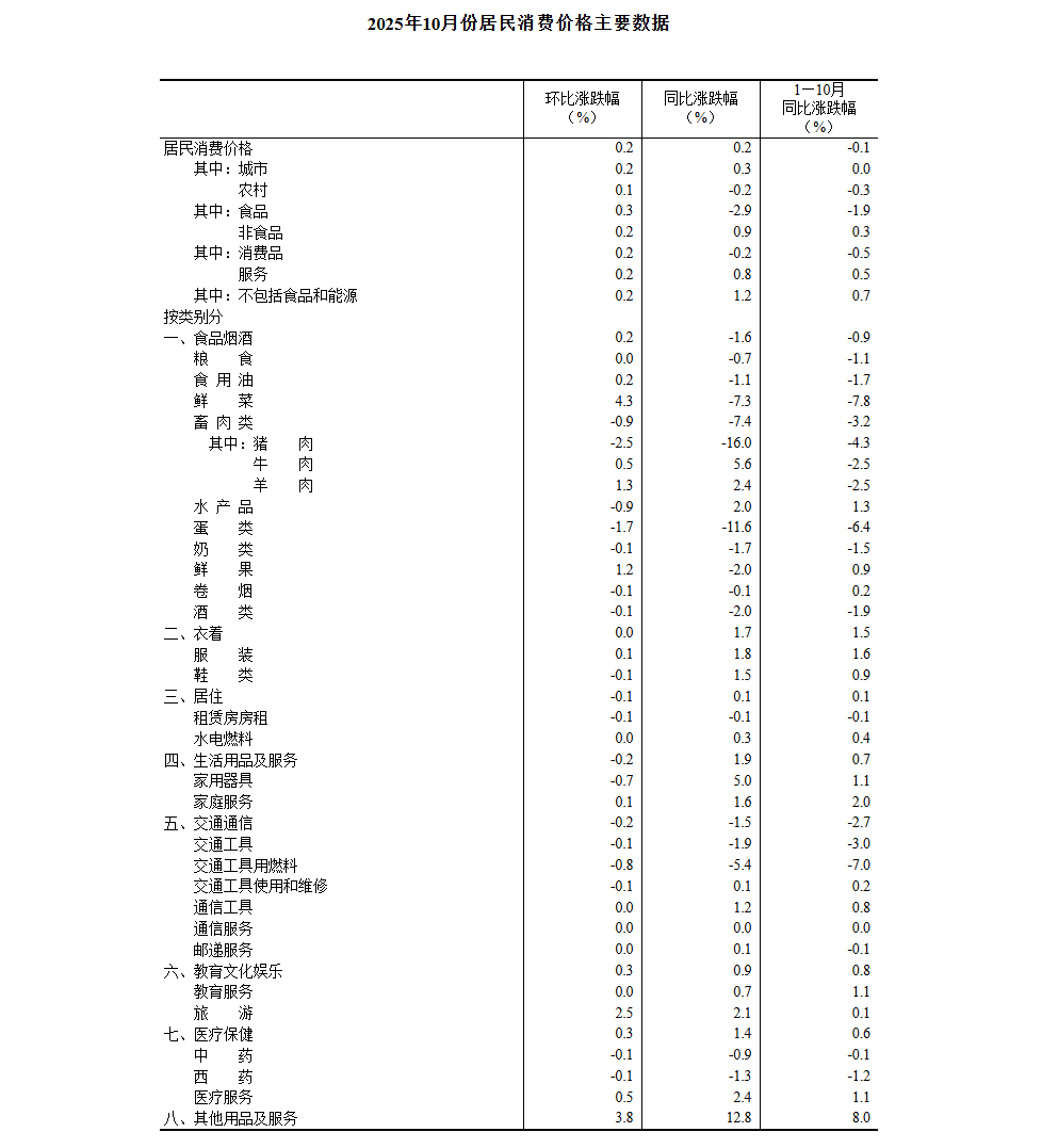2025年10月份,全国居民消费价格同比上涨0.2%。其中,城市上涨0.3%,农村下降0.2%;食品价格下降2.9%,非食品价格上涨0.9%;消费品价格下降0.2%,服务价格上涨0.8%。1--—10月平均,全国居民消费价格比上年同期下降0.1%。