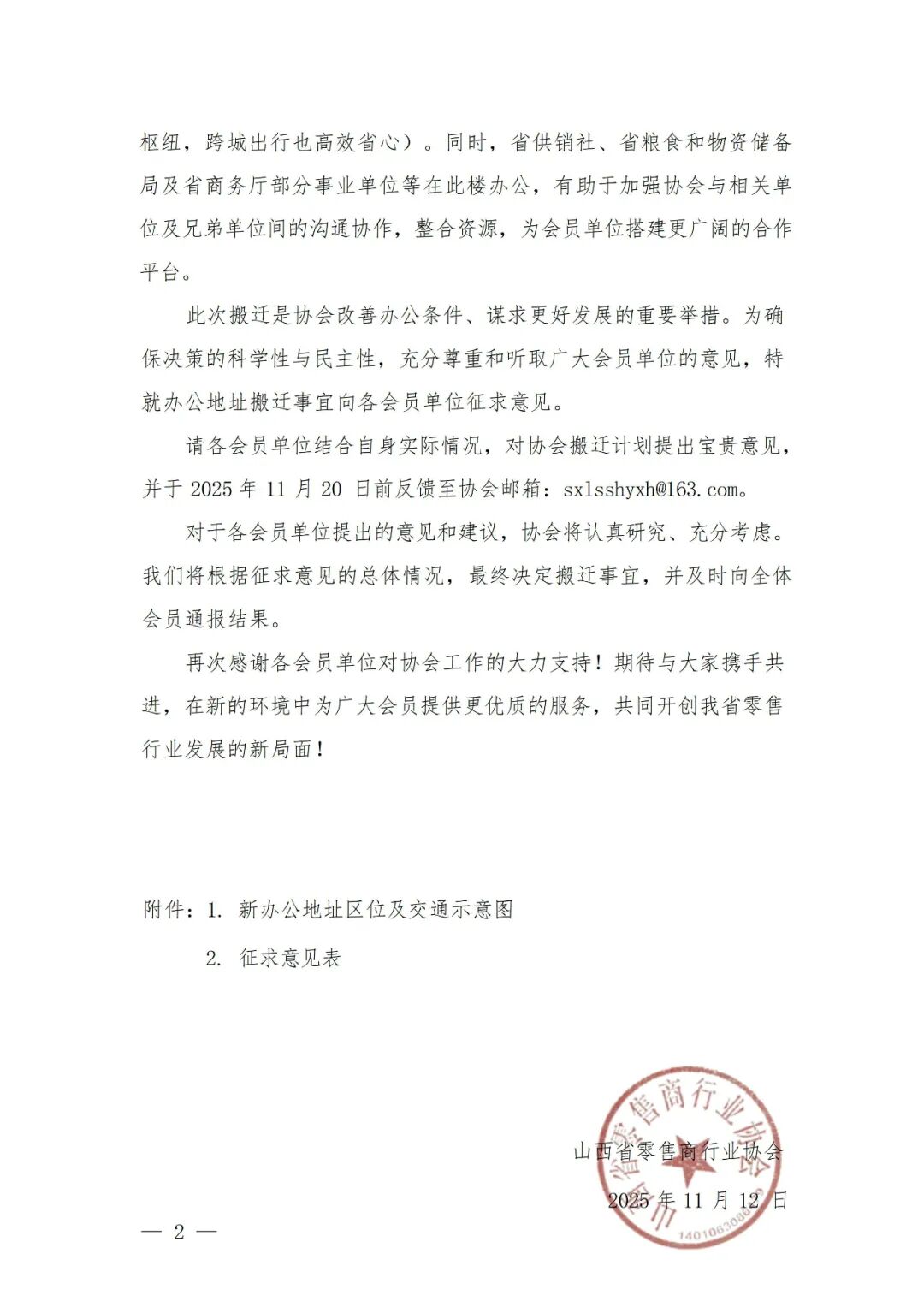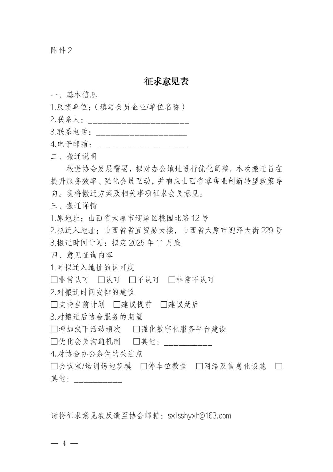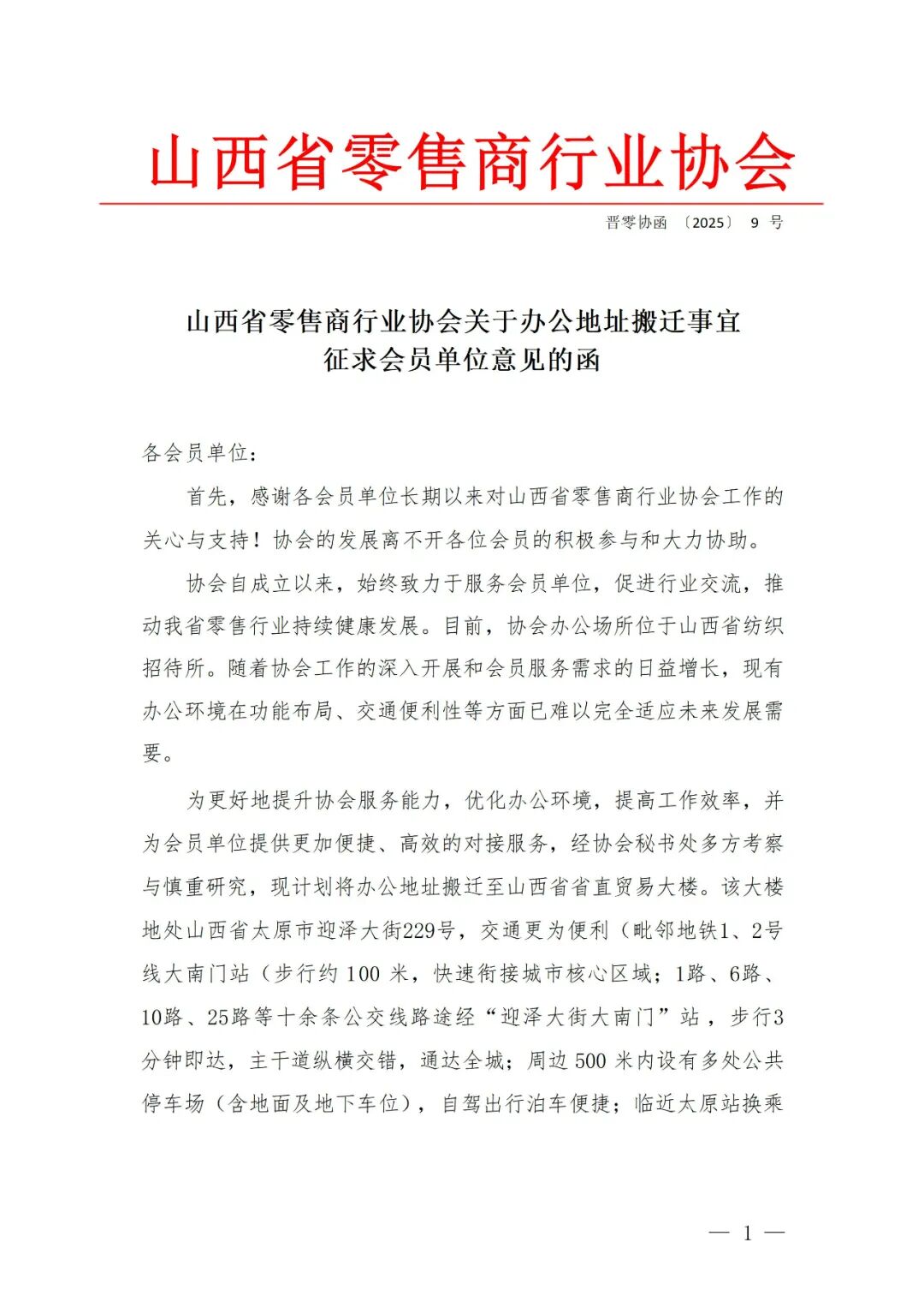 山西省零售商行业协会关于办公地址搬迁事宜征求会员单位意见的函