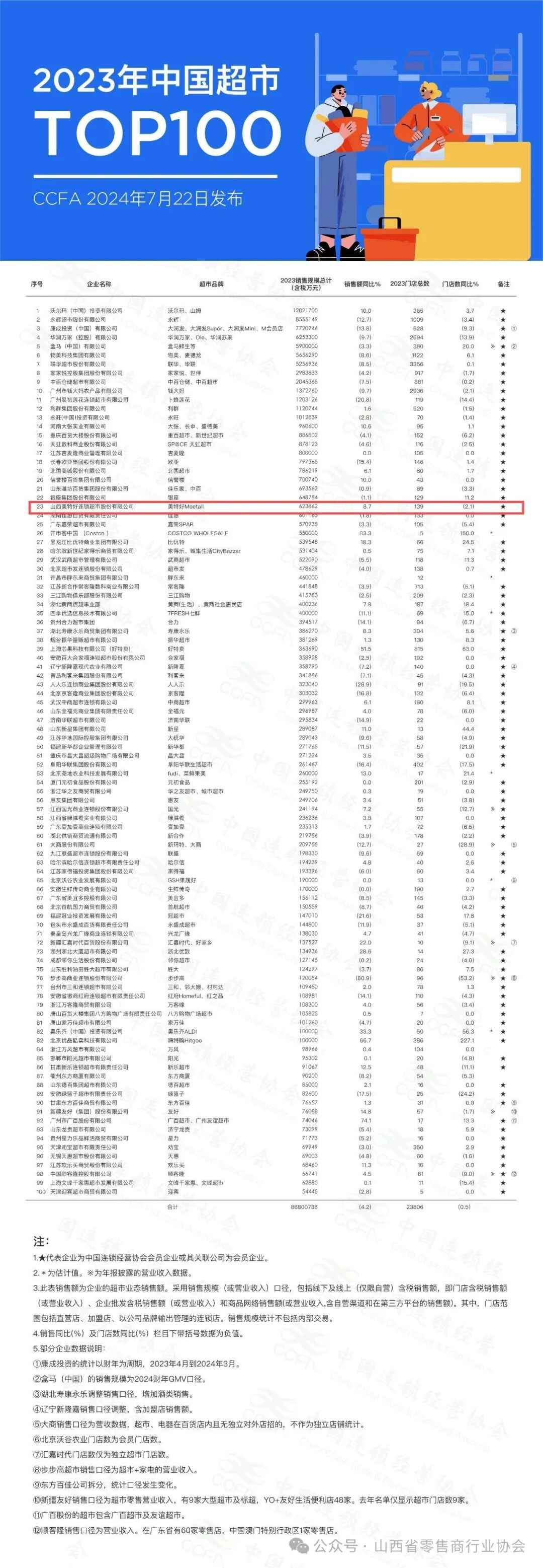近日,中国连锁经营协会(CCFA)公布“2023年中国超市TOP100”。协会常务副会长单位山西美特好超市连锁股份有限公司位居第23位,销售规模62.3862亿元,同比增长8.7%;门店数量139家,同比下降2.1%。排名较“2022年中国超市TOP100”的第28名前进了5名。2023年,超市TOP100企业销售规模为8680亿元,门店总数2.38万个,分别比上年的超市TOP100下降7.3%和16.2%。超市TOP100企业中,销售额100亿元以上的企业有13家,其中500亿元以上的企业7家。沃尔玛(中国)2023年实现销售1202亿元,居超市TOP100首位。从2023年超市TOP100企业的经营状况变化可以看出:1.在一二线城市,会员店、折扣店的销售以及门店数增长显著。代表性企业包括:沃尔玛、开市客、尧地、好特卖、奥乐齐、嗨特购等。2.近半超市经营发展稳健,部分来自低线区域。2023年超市TOP100企业中,有44家销售同比增长,其中有27家企业来自低线城市,代表性企业有:大张、信誉楼、比优特、黄商、寿康永乐等。3.2023年超市TOP100企业中,有33家企业的门店数增加、20家企业的门店数持平,但也有47家企业的门店数减少。