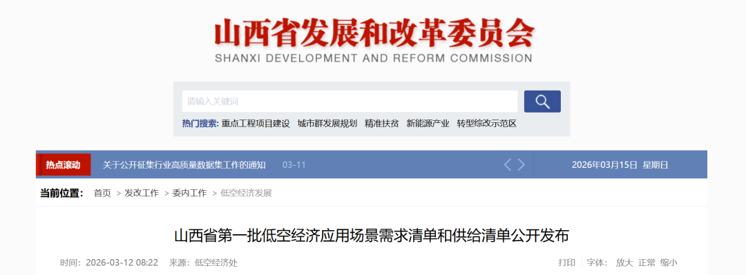 3月12日日,山西省发展改革委发布了我省第一批低空经济应用场景需求清单和供给清单,欢迎各类市场主体跟进对接参与。