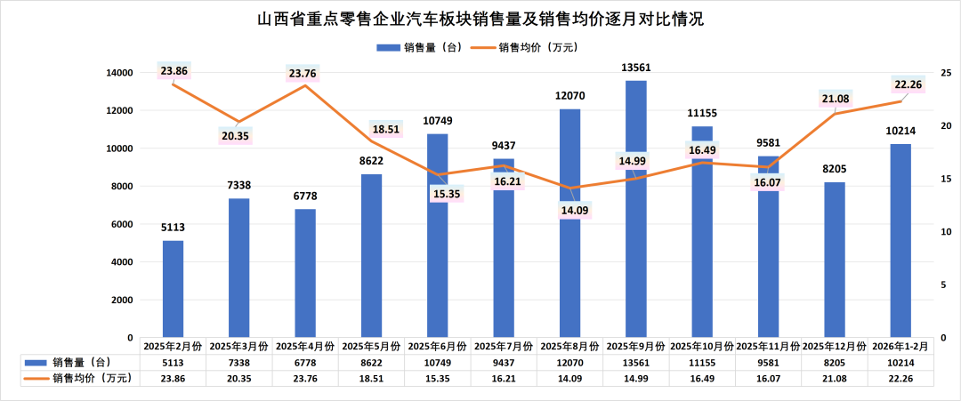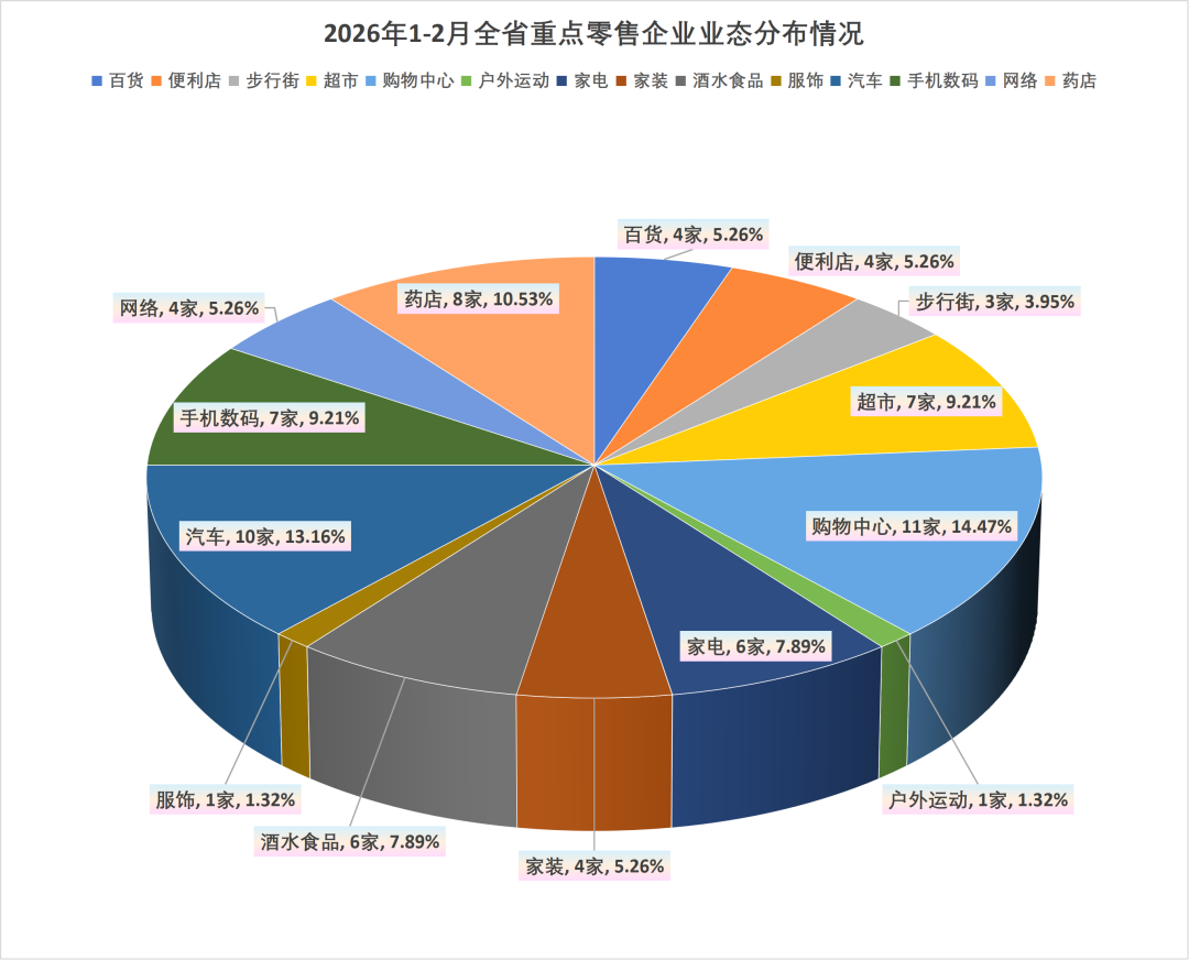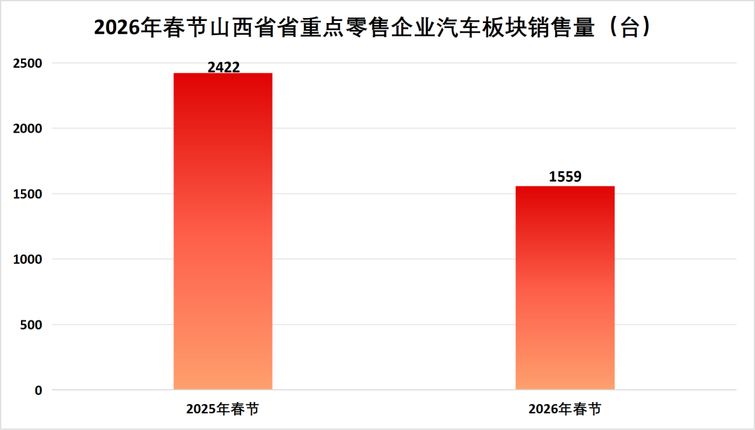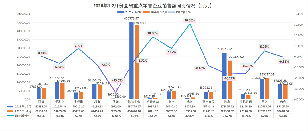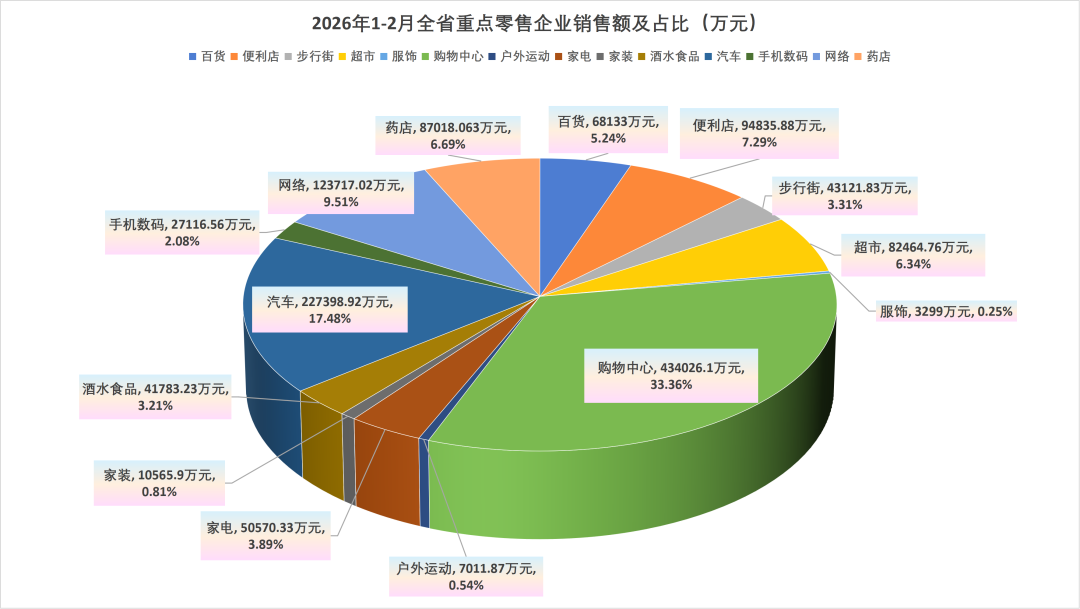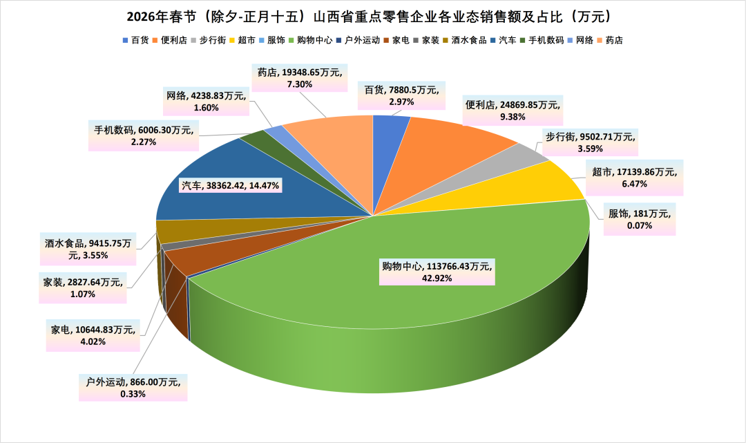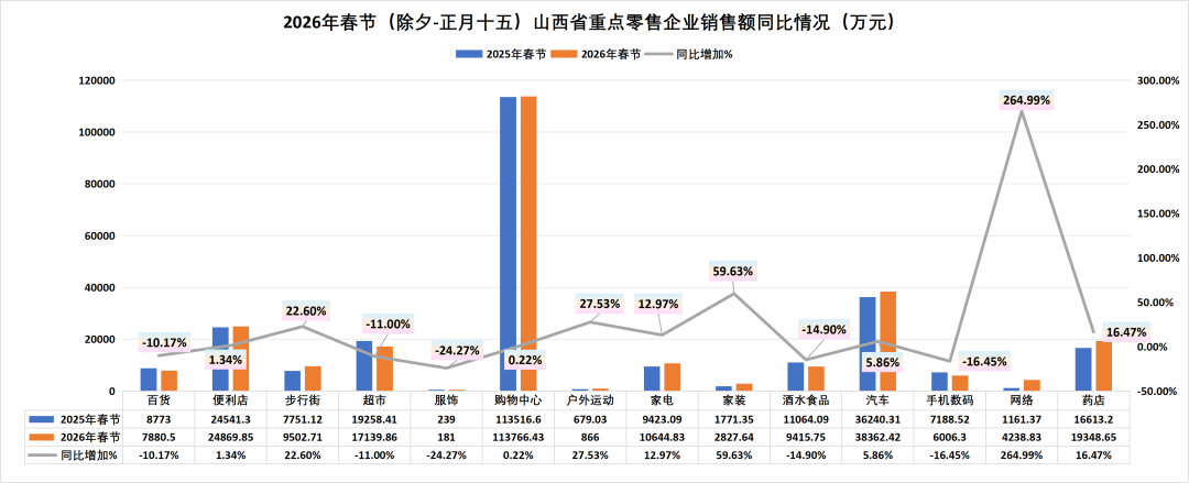 2026年3月,山西省零售商行业协会对山西省重点零售企业1-2月经营情况进行调查统计,本月调查企业数量76家。1-2月销售额1301062.46万元,同比下滑4.99%;春节期间(除夕-正月十五)销售额265050.78万元,同比增长2.65%。本次调查的全省76家重点零售企业主营业态分布为14个板块。购物中心、汽车板块企业数量占比总调查企业数量最多,比例分别为14.47%、13.16%。调查企业中药店板块8家、便利店板块4家、超市板块7家、百货板块4家、购物中心板块11家、网络板块4家、家电板块6家、汽车板块10家、手机数码板块7家、步行街板块3家、家装板块4家、酒水食品板块6家、户外运动1家、服饰板块1家。2026年1-2月,全省76家重点零售企业销售额共计1301062.46万元,其中购物中心、汽车、网络三大板块的销售额共计785142.04万元,占比60.34%。购物中心板块销售额434026.1万元,占比33.36%;汽车板块销售额227398.92万元,占比17.48%;网络板块销售额123717.02万元,占比9.51%。2026年1-2月,全省76家重点零售企业销售额共计1301062.46万元,同比下滑4.99%。板块同比“6升8降”,板块增幅和下滑幅度最大均超过30%。家装板块:1-2月销售额10565.9万元,同比增长30.8%;户外运动板块:1-2月销售额7011.87万元,同比增长18.5%;步行街板块:1-2月销售额43121.83万元,同比增幅7.77%;家电板块:1-2月销售额50570.33万元,同比增长7.62%;网络板块:1-2月销售额123717.02万元,同比增长5.26%;百货板块:1-2月销售额68133万元,同比增长0.41%。服饰板块:1-2月销售额3299万元,同比下降33.65%;汽车板块:1-2月销售额227398.92万元,同比下滑16.27%;手机数码板块:1-2月销售额27116.56万元,同比下滑15.78%;酒水食品板块:1-2月销售额41783.23万元,同比下滑8.63%;超市板块:1-2月销售额82464.76万元,同比下滑7.5%。汽车板块2026年国补政策从“定额补贴”调整为“按车价比例补贴”,新能源汽车车辆购置税由免征调整为减半征收,这一重大变化促使消费者更愿意“加点预算买更好”的车,推动中高端新能源车和燃油车销量增长,入门级纯电车或低价燃油车补贴金额缩水,吸引力下降,引导车市向“绿色+智能”消费升级,推动行业从“价格战”转向“价值战”。2026年1月8日山西省商务厅发布【关于2026年汽车以旧换新补贴公证摇号活动的通告】:2026年我省将汽车以旧换新补贴活动通过公证摇号形式开展,摇号资格进行筛查合格后可进行补贴手续上传,购置新车后才不影响补贴享受。摇号公示分阶段进行。一定上影响消费者决策。为拉动春节销售,2月13日山西省商务厅发布【关于调整2026年春节假期汽车以旧换新补贴政策的通告】:对2026年春节9天假期内(2026年2月15日至2月23日)购买新车的消费者,均可按政策要求申领汽车以旧换新补贴。从2025年的销售数据来看,国补对消费者选择较大。2月份的销售均价为23.86万元,之后销售均价一路下跌,至2025年8月跌至年内最低点14.09万元,9月政策调整后销售均价逐步上升,2026年2月份销售均价回升至22.26万元。全年的销售均价走势基本呈“V”型。销售量呈波浪形浮动。2026年1-2月汽车板块销售量为10214台,这个数字比2025年12月份的销售量8205台只增长了2009台,彰显出政策对销售的影响性。纵观2025年全年,消费品以旧换新政策拉动消费力强劲。2025年前9个月月同比均处于增长趋势,最高月同比达到28.89%。从10月开始下滑,11月达到年内最低值,12月开始回升。2026年1-2月月同比虽然下滑4.99%,但较2025年12月的下滑14.57%提高了9.58个百分点。市场呈现回暖态势。2026年春节来临的时间较2025年晚近20天,这也给企业营销活动提供了更加充分的准备时间,2026年春节期间(除夕-正月十五)山西省重点零售企业销售额265050.78万元,同比增长2.65%。其中购物中心、汽车、便利店板块销售额位列前三,占比为66.77%。2月10日,山西省商务厅发布【关于调整春节期间家电以旧换新、数码和智能产品购新补贴活动的通告】:补贴券在2026年春节期间由按周发放调整为按天发放,发放日期为2026年2月11日至2月26日(共16天),每天10时领券,线下核销截止时间为当日22时,线上核销截止时间为当日24:00票券有效期为1天。这一政策的发布对春节期间的相关板块起到了很好的带动引领作用。家电、手机数码、酒水食品、步行街、超市、药店板块春节销售额板块占比均高于1-2月销售额的板块占比,分别为4.02%、2.27%、3.55%、3.59%、6.47%、7.30%。购物中心板块:春节销售113766.43万元,占比42.92%,以绝对优势稳居第一;汽车板块:春节销售38362.42万元,占比14.47%;便利店板块:春节销售24869.85万元,占比9.38%。与去年同期相比,2026年春节全省重点零售企业销售额265050.78万元,同比增长6830.39万元,增幅2.65%。各板块“9涨5跌”,其中网络板块涨幅最猛,高达264.99%;5个板块同比下滑幅度均超过10%;服饰板块同比下滑幅度最大,下滑24.27%。网络板块:春节销售4238.83万元,同比增长264.99%;家装板块:春节销售2827.64万元,同比增长59.63%;户外运动板块:春节销售866万元,同比增长27.53%;步行街板块:春节销售9502.71万元,同比增长22.6%;药店板块:春节销售19348.65万元,同比增长16.47%服饰板块:春节销售181万元,同比下滑24.27%;手机数码板块:春节销售6006.3万元,同比下滑16.45%;酒水食品板块:春节销售9415.75万元,同比下滑14.9%;超市板块:春节销售17139.86万元,同比下滑11%;百货板块:春节销售7880.5万元,同比下滑10.17%。汽车板块2026年1-2月销售额同比下滑16.27%,但是春节期间的销