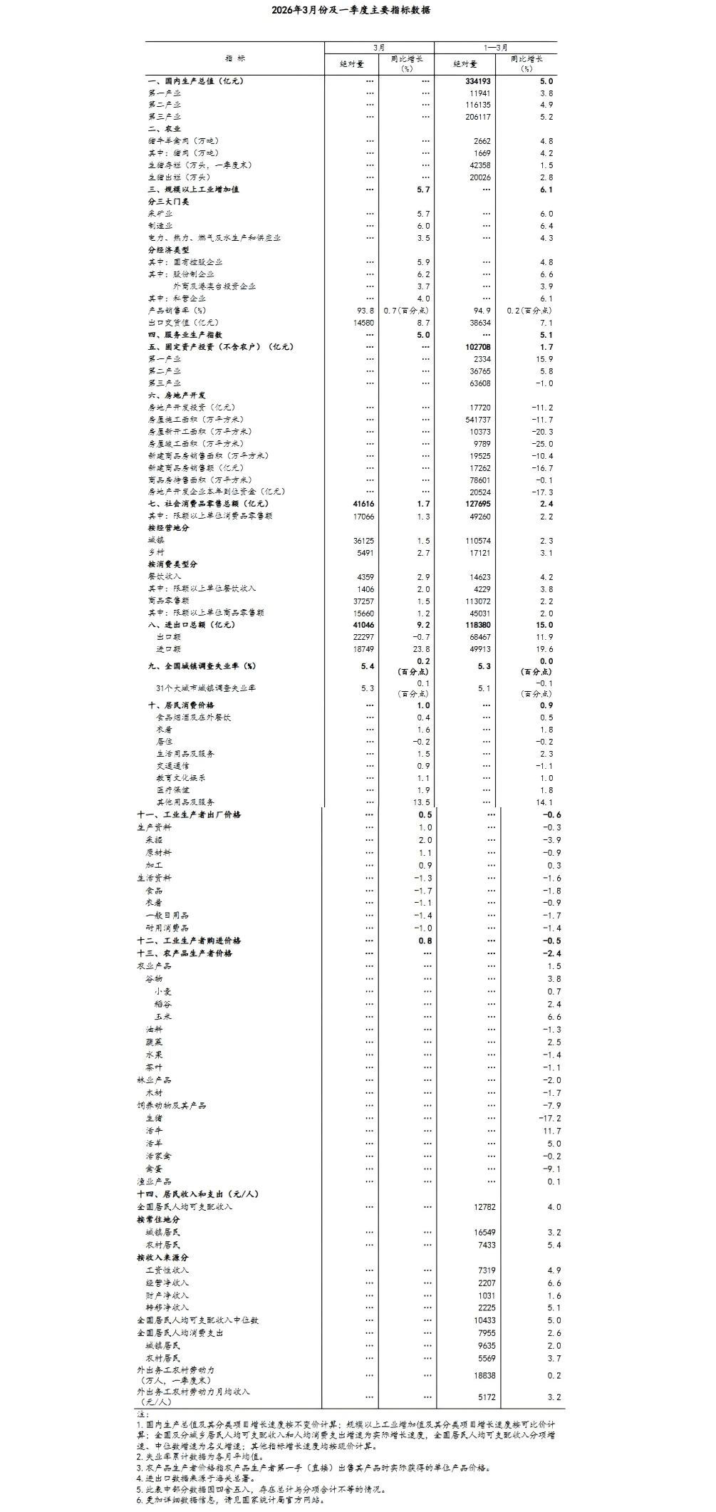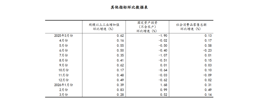 (2)根据季节调整模型自动修正结果,对近一年来各期国内生产总值、规模以上工业增加值、固定资产投资(不含农户)、社会消费品零售总额环比增速进行修订。修订结果及2026年一季度GDP环比数据、2026年3月份其他指标环比数据如下: