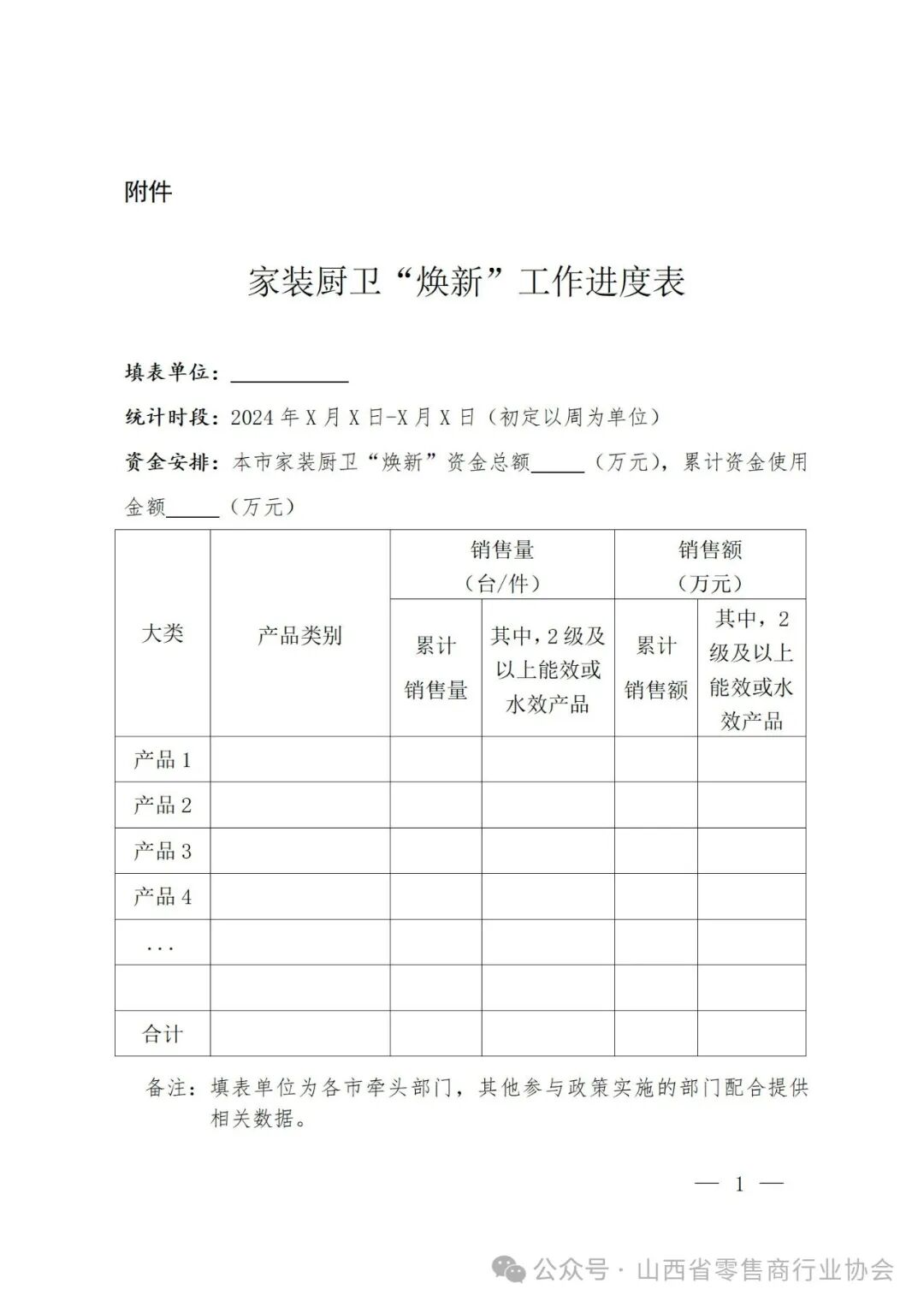 山西转型综改示范区管委会,各市商务局、发展改革委、工信局、民政局、财政局、住建局、水利局、市场监管局,各有关行业协会:为贯彻落实《山西省人民政府办公厅关于印发山西省加力支持大规模设备更新和消费品以旧换新具体举措的通知》(晋政办发〔2024〕48号)和《商务部等8部门办公厅关于做好家装厨卫“焕新”工作的通知》(商办消费函〔2024〕401号)中关于推动家装消费品“焕新”活动要求,支持各市开展家装消费品“焕新”活动,现将有关事项通知如下。自方案发布之日起(以各市政策发布时间为准)至2024年12月31日,并结合具体情况适时调整。活动资金由中央和省级按9:1配套,市县不需要再配套资金。补贴范围为家装消费品,重点支持旧房装修、厨卫等局部改造、居家适老化改造所用物品和材料购置、智能家居消费品。具体为以下四个方向、九种类型的消费品:(二)墙面类:壁纸、壁布、涂料、墙板、软(硬)包、门窗等;(四)家具类:沙发、茶几、餐桌餐椅、床、斗柜边柜等;(六)全屋定制类:定制橱柜、衣柜、书柜、榻榻米等。(七)厨卫类:橱柜、马桶、花洒、浴缸、浴室柜、面盆龙头、淋浴房等;(八)适老化改造类:防滑砖、防滑地胶、扶手、下压式门把手、闪光震动门铃、淋浴椅等;个人消费者在参与活动的商家购买符合补贴范围类型的产品,按照剔除商家所有折扣优惠后最终销售价格的15%享受一次立减,每位消费者每类产品可补贴1件,每件补贴不超过2000元。(一)按照“高效、便捷、操作性强”的原则,省商务厅通过公开征选方式,确定中国银联山西分公司为省级家装消费品“焕新”活动服务平台(以下简称服务平台)。各市商务局、山西转型综改示范区管委会要与平台进行对接并签订协议,明确具体服务内容。(二)消费者在支付时直接抵扣补贴资金。服务平台要形成消费者购买资格核验、家装消费品销售、资金核补、资金核算等闭环管理。(三)消费者登录服务平台家装消费品“焕新”专区填写个人基本信息(姓名、身份证号、电话号码等),发起购买意向需求,销售主体通过服务平台校验购买资格,消费者在线下门店或登录线上商城购买活动产品。每件产品需单独支付结算,销售主体需为每件产品单独开具发票。补贴资金由销售主体先行垫付,服务平台会同本地商务部门审核相关数据信息后进行拨付。(四)如发生消费者退货情形,销售主体要通过原支付渠道退还消费者实际支付金额(不包含补贴资金),并将退货相关的补贴资金退还财政。(五)各市商务局、山西转型综改示范区管委会需独立开展补贴发放,会商服务平台进一步优化补贴流程,制定风险防控举措,负责销售主体的选取和管理工作,并签订承诺书。(一)由各市商务局、山西转型综改示范区管委会确定参与政策实施的线上及线下销售主体。销售主体需提供品牌授权书或资质证明,能向消费者开具相关销售发票,具备和服务平台进行对接的能力,具有较强的仓储及配送能力,能够提供上门送货、安装、逆向物流等售后服务并保证服务质量,具有一定的资金垫付能力等。(二)管理运营规范。近2年内未发生过安全生产事故,未被列入失信被执行人或重大税收违法案件当事人名单,具有防范骗补、套补等行为的综合处置能力,在类似政策或活动中未发生重大资金安全风险和隐患。(三)未尽事宜由各市商务局、山西转型综改示范区管委会结合本地实际进行优化调整。(一)加强部门协同。各市商务局、山西转型综改示范区管委会负责活动策划、发放核销等工作,要加强统筹协调,成立工作专班,明确工作目标,细化落实举措,将家装消费品“焕新”活动纳入本地区消费品以旧换新实施方案,并向社会公布实施细则,精心组织好此项工作。要一视同仁支持不同所有制、不同注册地销售主体,线上平台和线下渠道参与家装厨卫“焕新”。要充分考虑各类消费者合理诉求和各类消费场景不同特点,周密制定工作预案,确保消费者获得中央政策红利,真金白银优惠直达消费者。各市发展改革、工业和信息化、民政、财政、住房城乡建设、水利、市场监管等部门强化协同配合,明确职责分工,切实抓好组织实施;以绿色、环保、智能、适老化为导向,有关部门要配合各市商务局、山西转型综改示范区管委会做好参与活动销售主体和产品的推荐工作。(二)深化政企协联动。建立家装厨卫“焕新”重点联系机制,覆盖主要生产、销售、回收企业、电商平台和金融机构等相关经营主体,听取政策落实意见建议,加强各方联动对接合作,推出切实惠民便民举措。对参与政策实施的经营主体开展数据监测,实时动态掌握资金兑付情况和各类产品销售数据。充分发挥相关行业协会作用,支持协会参与制定、实施行业标准,组织开展活动,积极宣贯政策,探索实施行业失信企业“黑名单”制度和快速纠纷协调机制,强化行业自律。坚持标准引领,工业和信息化、住房城乡建设、市场监管部门按照《以标准提升牵引设备更新和消费品以旧换新行动方案》(国市监标技发〔2024〕34号)职责分工,强化家具、建材、装饰装修产品、厨卫五金、卫生洁具、陶瓷砖等家居产品质量标准和智能家居互联互通、风险识别标准的指导应用。探索制定适合本地的家装服务标准、家庭装修改造指南等地方标准或规范。要指导督促相关主体认真贯彻各项安全生产