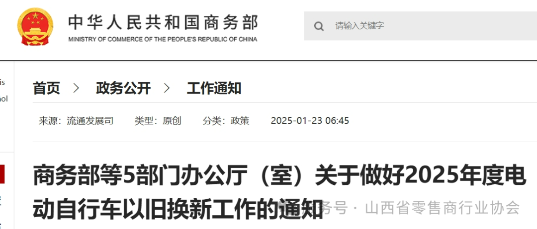 为贯彻落实党中央、国务院决策部署,按照全国电动自行车安全隐患全链条整治行动,以及国家发展改革委、财政部《关于2025年加力扩围实施大规模设备更新和消费品以旧换新政策的通知》(发改环资〔2025〕13号)要求,经全国电动自行车安全隐患全链条整治工作专班(以下简称专班)同意,2025年继续开展电动自行车以旧换新工作。现将有关事项通知如下:2025年度延续开展电动自行车以旧换新工作,活动自2025年1月1日起。2025年电动自行车以旧换新补贴标准由商务部指导各地结合实际合理制定,与上年补贴标准相衔接,保持工作平稳过渡。对个人消费者交售报废老旧电动自行车并换购合格新车的,给予以旧换新补贴。交售报废老旧锂离子蓄电池电动自行车并换购铅酸蓄电池电动自行车的,可适当加大补贴力度。鼓励享受补贴的消费者购买符合《电动自行车行业规范条件》企业生产的合格电动自行车新车。鼓励各级人民政府结合本地区实际情况,利用地方财政资金对交回高风险隐患的电动自行车用锂离子蓄电池并换购符合《锂离子电池行业规范条件》企业生产的锂离子蓄电池的个人消费者,给予补贴;对《电动自行车安全技术规范》(GB17761—2024)(以下简称《规范》)发布后,名下无电动自行车且首次购买符合《规范》要求新车的个人消费者,可给予补贴;对交售报废老旧电动自行车并换购符合《电动自行车行业规范条件》企业生产的新车或符合《规范》要求新车的个人消费者,可适当加大补贴力度。用于参加以旧换新活动的电动自行车新车,应具有符合现行强制性国家标准的产品合格证、强制性产品认证(CCC)证书。电动自行车以旧换新补贴流程及方式由地市级(含)以上商务主管部门结合实际自主确定。鼓励简化门店参加以旧换新活动的资格审核和准入程序,扩充参加以旧换新活动的门店数量。鼓励进一步简化补贴发放流程,在确保资金安全的情况下,取消补贴申请、审核、拨付中的非必要环节,加快审批进度,尽量缩短补贴到账时间。补贴发放可不与新车上牌挂钩。鼓励采用支付立减等方式,补贴优惠直达消费者。鼓励以销售门店为场景,提供售旧、换新、辅助上牌等“一站式”服务,便利消费者。商务部牵头推动电动自行车以旧换新,指导各地开展工作。地市级(含)以上商务主管部门在当地人民政府和电动自行车安全隐患全链条整治工作专班(以下简称专班)统一领导下,牵头做好本区域电动自行车以旧换新工作的具体实施。对以旧换新涉及的相关环节,要依托当地专班认真落实国务院办公厅《电动自行车安全隐患全链条整治行动方案》有关分工,打通卡点堵点,提升安全管理水平。地市级(含)以上商务主管部门按照公开公平原则,自主确定参加电动自行车以旧换新活动的销售企业或门店(含个体工商户等),名单要向社会公示。参加活动的销售企业或门店要做好政策宣传,做到政策图解、价格公示、监督电话、承诺书“四上墙”;要承诺不得先涨价再补贴,参与以旧换新补贴车型的销售价格,不高于参加活动前1个月内同款产品的平均成交价格,特殊情况由地市级(含)以上有关部门因地制宜确定。经查实违反相关规定,存在先涨价再补贴、承诺不实等行为的,由地市级(含)以上商务主管部门取消补贴资格,函告本级有关部门依法依规处置,并抄送本级专班。销售企业或门店(含个体工商户等)要签订承诺书(具体样式见附件1)。来源权属明确且配备车载电池的报废老旧电动自行车可参加以旧换新(含无牌),资格确认方式由地市级(含)以上商务主管部门结合实际自主确定。交售的老旧电动自行车必须交由具备相关资质的回收企业报废处置,并完善交接手续。经有关主管部门推荐,地市级(含)以上商务主管部门要组织确定并公布参加以旧换新的回收企业目录,每个城市不少于两家。推动增加回收企业数量,合理提高交售旧车的价格,激励消费者选择正规渠道交售报废旧车。回收企业要签订承诺书(具体样式见附件2),落实相关标准制定部门的要求,及时清运交至销售门店的老旧车辆,做到“一日一清”,回收的老旧电动自行车及自带的锂离子蓄电池、铅酸蓄电池应规范移交给拆解或综合利用企业安全储存并专业处置,不得非法拆解、流入二手市场。各级商务主管部门要加强宣传引导,做好政策解读,鼓励采取短信提醒、新媒体等方式广泛开展宣传,扩大政策知晓度和普及面。及时总结成熟经验和典型案例,加强经验交流。要注重群众宣传发动,广泛开展以旧换新进社区宣传活动,营造浓厚以旧换新氛围。各省、自治区、直辖市及计划单列市、新疆生产建设兵团商务主管部门要按照商务部统一提供的数据字段要求,完善电动自行车以旧换新数据归集系统,规范开展数据收集,提升数据的准确性和时效性,做到旧车去向、新车来源、消费者信息可查。商务部等5部门办公厅(室)《推动电动自行车以旧换新实施方案》(商办流通函〔2024〕396号)及专班相关工作通知继续施行。与本通知不一致之处,以本通知为准。 商务部办公厅 工业和信息化部办公厅